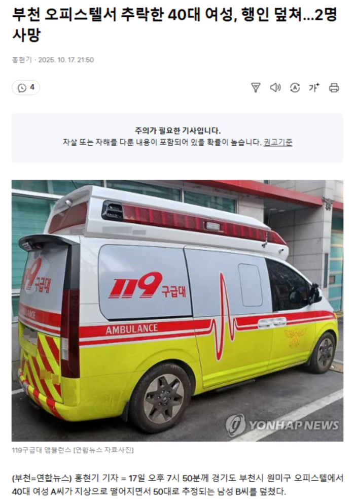 이 사고로 B씨가 그 자리에서 사망했고 A씨는 크게 다쳐 119구급대에 의해 병원으로 옮겨졌으나 숨졌다.