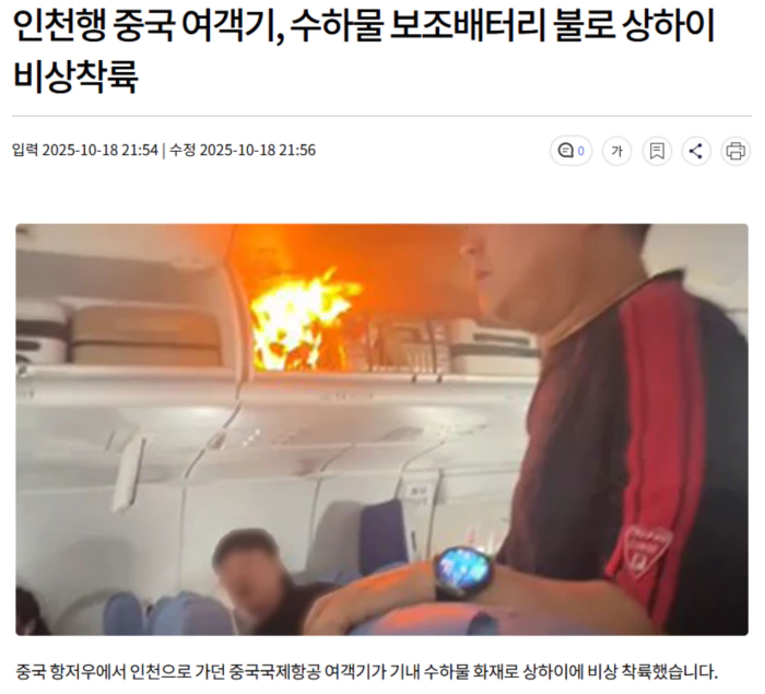 항공사 측은 "한 여행객이 수하물 칸에 실은 리튬배터리가 자연 발화했다"며 "승무원들이 절차에 따라 즉시 처치해 인명피해는 없었다"고 밝혔습니다.
