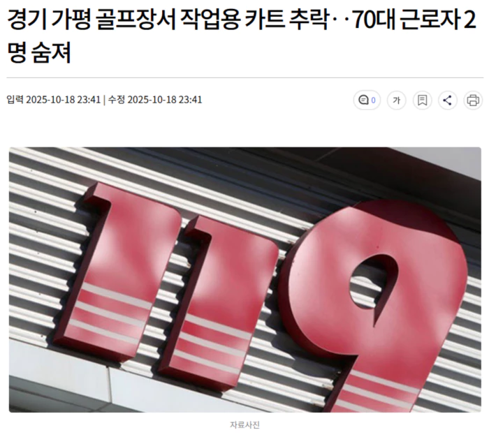 오늘(10/18) 오후 1시쯤 경기 가평군 상면 대보리의 한 골프장 도로에서 작업용 카트가 5m 아래 굴다리로 추락했습니다.