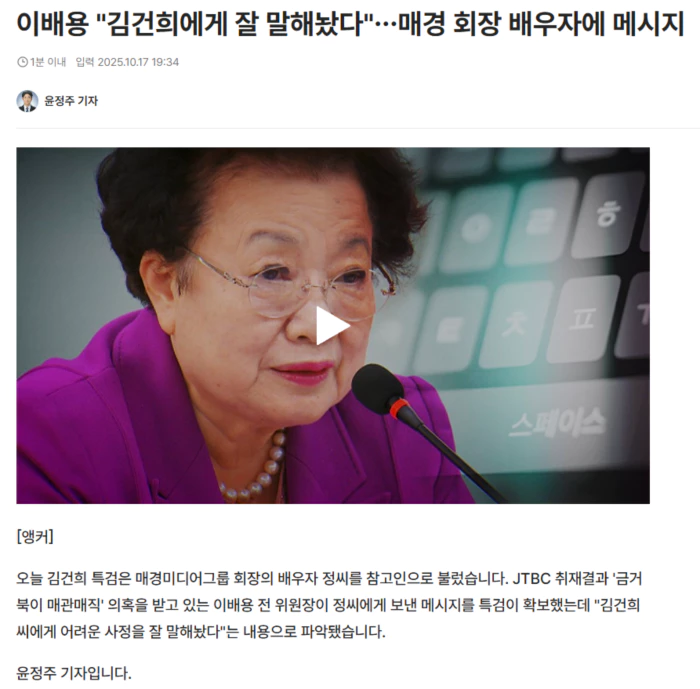 '금거북이 매관매직' 의혹을 수사하던 특검은 이 전 위원장이 매경미디어그룹 회장의 배우자 정모 씨에게 보낸 카카오톡 메시지를 확보했습니다.