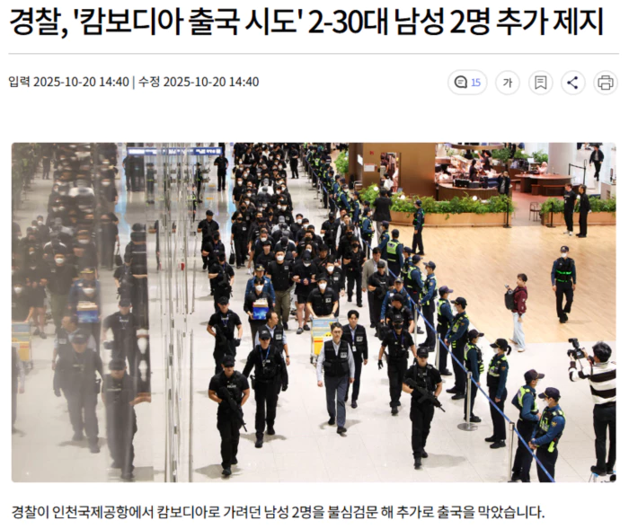 인천국제공항경찰단은 그제 저녁 7시쯤 캄보디아행 비행기에 오르려던 20대 남성의 출국을 막은 데 이어, 어제저녁 7시쯤에도 30대 남성의 탑승을 제지했다고 밝혔습니다.
