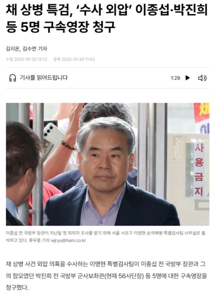 특검팀은 20일 직권남용 권리행사 방해 혐의 등으로 이 전 장관과 박 전 보좌관, 김동혁 전 국방부 검찰단장, 유재은 전 국방부 법무관리관, 김계환 전 해병대 사령관에 대한 구속영장을 서울중앙지법에 청구했다고 밝혔다.