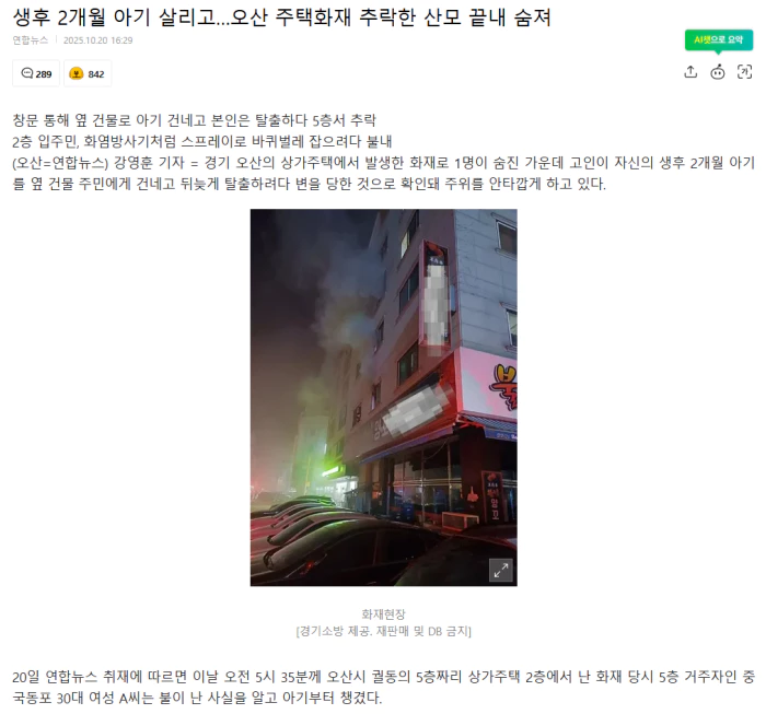 A씨는 약 2달 전 출산을 한 산부로, 남편과 함께 아기를 안고선 창문을 열어 큰 목소리로 구조를 요청했다. 불이 난 상가주택과 바로 옆 건물은 거리가 1m도 되지 않을 정도로 가까워 이 소리를 들은 사람들은 창문을 열어 A씨 등의 목소리에 답했다. 다급했던 A씨와 남편은 창문을 통해 우선 아기를 옆 건물 주민에게 건넸고, 이 주민은 안전하게 아기를 받았다고 한다. 이어 A씨의 남편이 옆 건물 창문으로 건너가 탈출에 성공했고, 그다음은 A씨의 차례였다. A씨 역시 남편과 마찬가지로 옆 건물 창문으로 건너가려 했는데, 미처 창문 안쪽까지 들어가지 못한 채 아래로 추락했다. 크게 다친 A씨는 아주대학교 병원으로 옮겨져 치료받았으나, 사고 발생 5시간여 만인 오전 10시 40분께 끝내 사망했다. 경찰은 2층에서 발생한 화재로 인해 연기가 다량으로 발생하면서 계단을 이용한 대피가 막힌 A씨와 남편이 불가피하게 창문을 통한 탈출을 한 것으로 보고 있다. 더욱이 생후 2개월 아기에게 화재로 인한 유독가스는 한 차례 호흡만으로도 치명적일 수가 있기 때문에 이런 선택을 한 것으로 추정한다. 경찰 관계자는 "아내를 잃은 유족(A씨의 남편)을 상대로 지금 당장 조사를 할 수 없어서 대피 과정에 대한 진술을 청취하지 못한 상황"이라며 "일단 A씨의 아기와 남편이 창문을 통해 옆 건물로 대피한 것은 확인이 됐다"고 말했다. A씨는 출산 이후 조금씩 건강을 회복하면서 집에서 아기를 돌봐왔으며, 같은 중국동포인 남편은 인근 식당에서 일하며 성실히 살아온 것으로 알려졌다. 그런데 새벽 시간대 예기치 못하게 맞닥뜨린 화재는 이들 가정의 행복을 산산조각 내버렸다. 불은 2층에 거주하는 20대 여성 B씨가 라이터와 스프레이 파스를 이용해 마치 '화염방사기'처럼 불을 뿜어 바퀴벌레를 잡으려다 발생한 것으로 파악됐다.