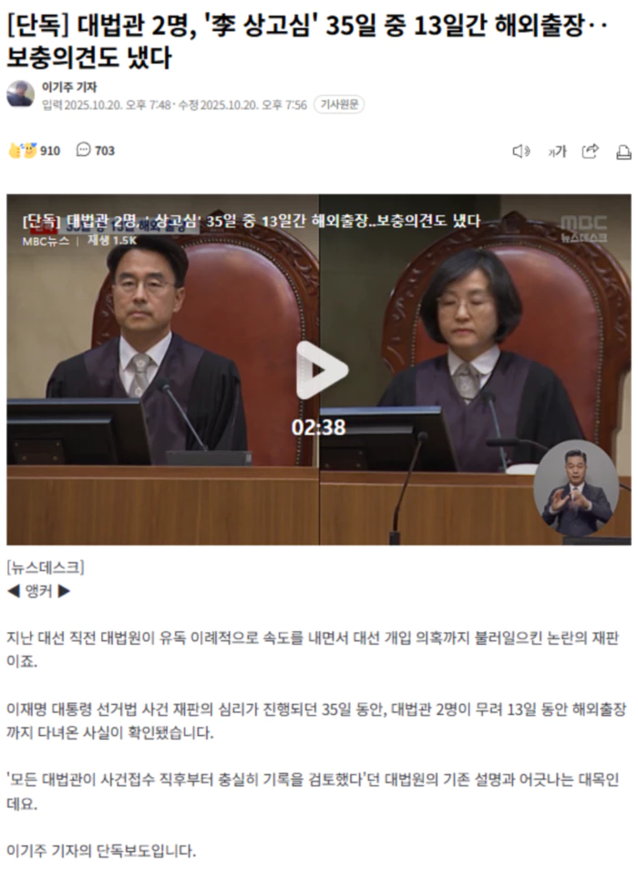 ◀ 리포트 ▶ 이재명 대통령 선거법 사건이 대법원 접수 35일 만에 파기환송된 직후, 대법원은 "모든 대법관들이 기록을 충실하게 검토했다"고 밝혔습니다. [천대엽/법원행정처장 (지난 5월 2일)] "대법관님들께서 이제 접수되는 대로 지체 없이 제출 문서를 읽어 보고 그 내용을 숙지했다라는 등등 충실하게 기록을 검토하고 판결을 내렸다라는…" 그런데 MBC 취재 결과, 당시 재판에 참여한 12명의 대법관 중 권영준 대법관과 신숙희 대법관이 상고심 기간 35일 가운데 무려 13일이나 해외출장을 다녀온 것으로 확인됐습니다. 대법원이 더불어민주당 서영교 의원실에 제출한 자료에 따르면, 권 대법관은 지난 3월 29일부터 4월 10일까지 13일 동안 호주와 칠레를 거쳐 미국을 다녀왔고, 신 대법관은 4월 7일부터 19일까지 역시 13일 동안 남아프리카공화국과 아일랜드에 출장을 다녀왔습니다. 출장 사유는 세계최고행정법원협회 총회 참가와 세계여성법관협회 회의 참가. 검찰의 상고이유서 제출과 상고이유서의 집행관 촉탁, 이 대통령 측의 변호인 선임과 답변서 제출 등, 이 사건으로 대법원이 긴박하게 돌아갈 무렵 대법관 2명은 국내에 없었던 겁니다. 두 대법관은 이후 유죄 취지의 의견을 냈는데, 특히 신숙희 재판관은 "지연된 정의는 정의가 아니다, 달력상 날짜의 총량만이 충실한 심리를 반영하는 것은 아니다"라는 보충 의견까지 냈습니다. 민주당에선 "35일 중 13일을 해외에 있었는데 충실한 검토가 가능했겠느냐"는 비판이 쏟아졌습니다. .. 후략 ..