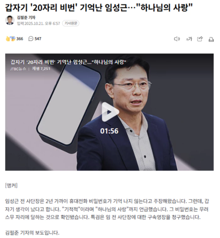 [기자] 지난해 1월 임성근 전 해병대 1사단장을 압수수색한 공수처는 임 전 사단장의 휴대전화를 확보했지만 유의미한 자료를 파악하진 못했습니다. 임 전 사단장이 압수수색 직전 변호인 조언에 따라 비밀번호를 설정했기 때문입니다. [임성근/전 해병대 1사단장 : (공수처에 비밀번호를) 알려주지 않았습니다. 알려줄 의사는 있는데…기억하지 못하고 있습니다.] 특검은 비밀번호를 알아내기 위해 대검에 의뢰했지만 실패해 결국 휴대전화를 돌려줬습니다. 그런데 임 전 사단장이 어제 갑자기 20자리에 달하는 비밀번호가 생각났다며 특검에 비밀번호를 제출했습니다. 임 전 사단장은 "셀 수 없이 많은 시도를 거듭하다가 새벽에 기적적으로 비밀번호를 확인했다"면서 "하나님의 사랑을 느끼게 됐다"고 밝혔습니다. 자신에게 유리한 정황이 담겼다는 겁니다. 하지만 정작 휴대전화는 제출하지 않았고 비밀번호을 제출한 어제는 특검이 이종섭 전 국방부 장관 등 5명의 구속영장을 청구한 날입니다. 이에 따라 특검은 본인의 구속을 면하려 비밀번호를 제공한 것으로 의심하고 있습니다. .. 후략 ..