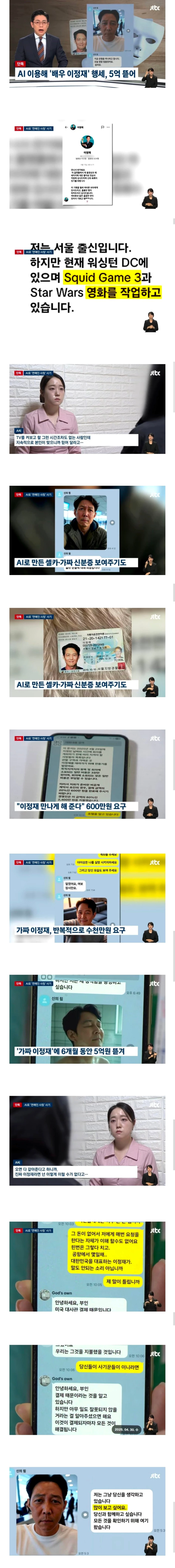 AI로 만든 가짜 이정재 씨 사진과 가짜 운전면허증을 보내 피해자를 속였습니다.