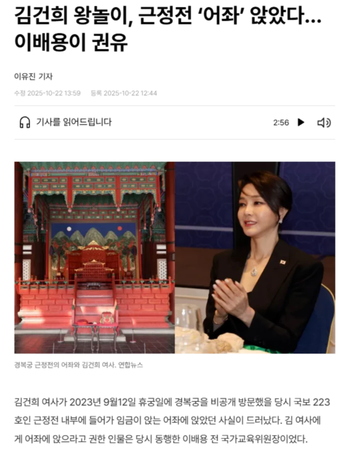22일 국회 문화체육관광위원에서 열린 국립중앙박물관 등에 대한 국정감사에서 양문석 더불어민주당 의원은 정용석 국립박물관문화재단 사장을 상대로 ‘김 여사가 어좌에 왜 앉았나’, ‘누가 앉으라고 했나’ 등을 여러 차 추궁했다. 정 사장은 당시 대통령실 문화체육비서관실 선임행정관으로 최응천 당시 문화재청장, 경복궁 관리소장 등과 함께 김 여사의 경복궁 방문을 수행한 인물이다. 당시 상황을 가장 정확하게 알 수 있는 당사자면서도 정 사장은 대답을 주저하며 “기억이 잘 안 난다. 잘 모르겠다”고만 했다. 그러자 김교흥 문체위원장이 나서 “당시 현직 행정관으로 김 여사 옆에 있지 않았나. 대한민국 국민 가운데 누구도 용상에 앉아본 적이 없다. 그런데 (김 여사가 어좌에 앉은 사실을) 왜 기억을 못 하냐”며 정 사장을 질책했다. 그제야 정 사장은 “본인이 가서 (어좌에) 앉으셨지 않을까 싶다”며 “계속 이동 중이었기 때문에 (어좌에 앉았던 시간은) 1~2분 정도”라고 털어놨다. 이후 이기헌 민주당 의원이 “이 전 위원장이 김 여사에게 어좌에 앉아보라고 권유했나’라고 묻자 정 사장은 “그러지 않으셨을까 (싶다)”고 답했다. 이 의원이 재차 “이 전 위원장이 (어좌에) 올라가라고 했기 때문에 김 여사가 올라간 것 아니냐”고 묻자 정 사장은 “상황이 그렇다”며 이 전 위원장이 권유한 사실을 인정했다. 근정전 중앙에 놓인 어좌는 임금의 의자로, 어좌 뒤에는 해와 달, 5개의 봉우리, 소나무, 폭포, 파도 등이 그려진 ‘일월오봉도’가 있다.