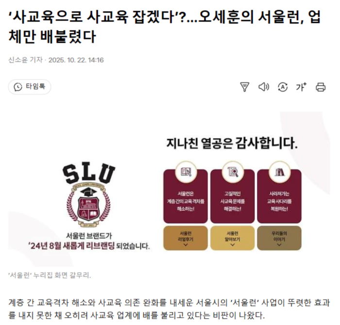 교육시민단체인 좋은교사운동과 사교육걱정없는세상, 위성곤 더불어민주당 의원은 22일 오전 국회 소통관에서 기자회견을 열어 서울런 사업의 전면 재검토를 요구했다. 이들은 사교육 문제 해결을 목표로 추진 중인 서울런 사업비의 상당 부분이 사교육 업체에 지급된 점을 지적했다. 서울시에 따르면, 2023~2025년의 서울런 사업 총예산은 각각 190억원, 162억원, 198억원 수준이다. 이 가운데 온라인 학습 콘텐츠 업체에 집행한 비용은 2023년 59억원(30.8%), 2024년 70억원(43.3%)으로 예산의 3분의 1가량이 사교육 콘텐츠를 구매하는 데 쓰였다. 올해는 관련 비용이 아직 집계되지 않은 상태다. 한성준 좋은교사운동 공동대표는 “사교육을 받을 기회조차 없으니 쿠폰을 줘서 기회의 공정성을 높이겠다는 것은 공공기관의 교육 정책으로서 방향 자체가 잘못 설정된 것”이라고 지적했다. 한 공동대표는 “타 시도에 영향력이 큰 서울시가 국민의 세금으로 공공의 영역에서 사교육 시장을 키우는 것도 바람직하지 않은 신호”라고 말했다. 사교육비 경감, 교육 격차 해소 등 서울런 사업의 목표에 대해서도 실효성이 떨어진다는 평가다. 서울런 사용자들의 절반 가량은 월평균 사교육비 지출 변화가 없거나 증가한 것으로 나타났다. 서울시가 제공한 사용자 사교육 지출 변화를 보면, 사교육비 지출에 변화가 없다는 답변을 한 이들은 2023년 51.9%, 지난해 44.5%로 나타났다. 오히려 사교육비가 늘었다는 이들도 각각 6.0%, 3.0%였다. 이는 서울런 사용자들의 절반가량이 기존 사교육을 유지하면서, 서울런을 통해 사교육 콘텐츠를 추가로 공급받는다는 의미다. 교육 격차 해소 효과도 뚜렷하지 않다. 서울시가 공개한 2022~2024년 서울런 서비스 이용고객 만족도 조사 중 학업성취도 변화를 보면, 학습역량이 75점, 78점, 80점으로 조금씩 올라가긴 했다. 하지만 단체들은 “서울시에 서울런 이용 전후 평균 성적 변화 자료를 요청했으나, 가입자의 학업 성취도 변화 자료만 보내왔다”며 “실제 시험 점수가 아닌 이용자 만족도 조사에 기반을 둔 결과로, 객관적이고 실질적인 성과를 확인하기 어렵다”고 지적했다. 단체들은 “서울런의 사업 효과를 증명할 수 있는 객관적 성과 측정 시스템 구축에 나선 뒤, 그 측정 결과를 공개할 것”을 요구했다. .. 후략 ..