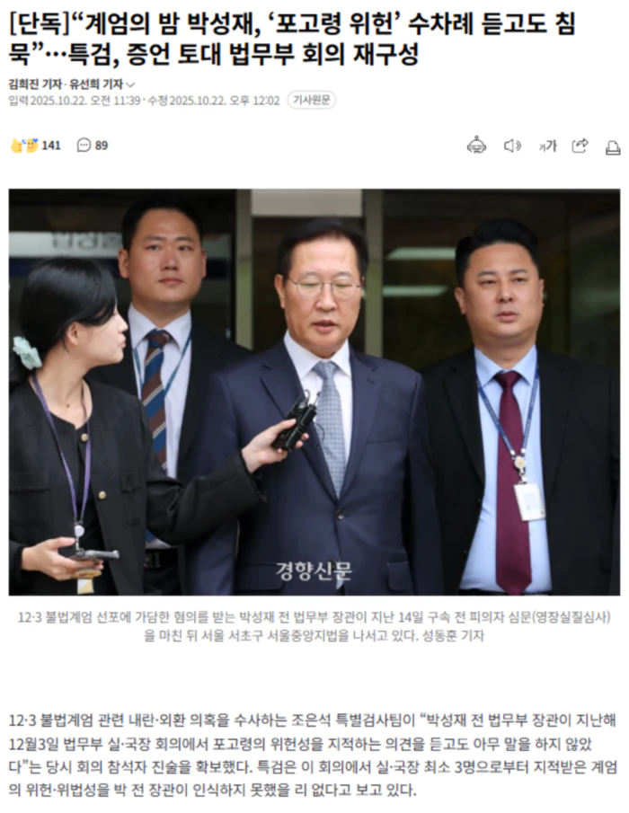 (출처: [단독]“계엄의 밤 박성재, ‘포고령 위헌’ 수차례 듣고도 침묵”···특검, 증언 토대 법무부 회의 재구성)