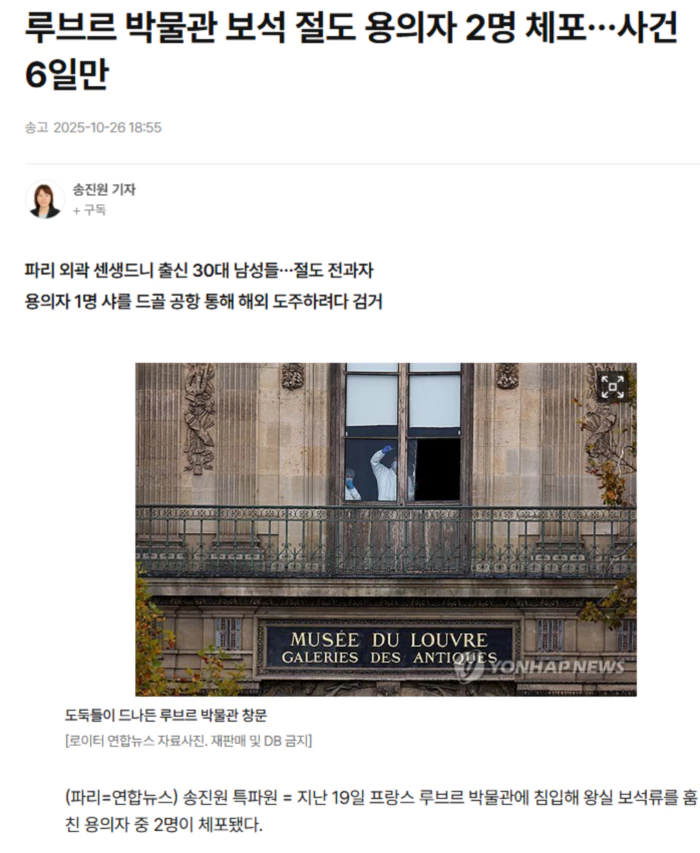 프랑스 일간 르파리지앵, 르피가로에 따르면 수사 당국은 25일(현지시간) 밤 용의자 2명을 조직적 절도 및 범죄조직 결성 혐의로 체포해 구금했다. 사건 발생 6일 만이다.