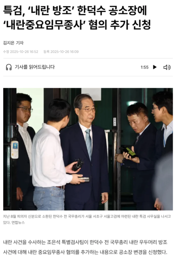 특검팀은 한 전 총리 사건을 심리하는 서울중앙지법 형사합의33부(재판장 이진관)에 공소장 변경 허가 신청서를 제출한 것으로 26일 확인됐다. 이는 앞서 이 재판부가 특검팀에 “기본적 사실관계가 동일한 범위 내에 형법 87조2항(내란 중요임무종사)으로 선택적 병합하는 형태로 공소장 변경을 요구한다”고 한 데 따른 것이다. 특검팀은 지난 8월29일 한 전 총리를 재판에 넘기면서 내란 가담자 중 처음으로 내란 중요임무 종사가 아닌 내란 우두머리 방조 혐의를 적용해 불구속기소했다. 여기에 선택적 병합을 할 경우, 내란 중요임무 종사까지 두 혐의가 모두 공소장에 추가되며 재판부가 한 가지를 선택해 판단할 수 있게 된다. 한 전 총리가 윤석열 전 대통령의 내란을 단순히 방조한 게 아니라 가담한 것으로 볼 여지가 생긴 것이다. 앞서 특검팀은 내란 방조 혐의로 기소한 것과 관련해 “특검도 기소 당시에 인정된 사실에 대한 법률 적용과 관련해 여러 논의가 있었다”며 “사실상 내란 우두머리 방조 혐의가 내란 중요임무 종사 혐의보다 법정형이 더 높은 점을 고려해서 (해당 혐의로) 기소했던 것”이라고 설명했다. .. 후략 ..
