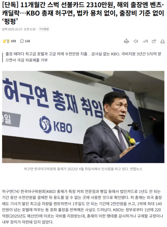 (출처: [단독] 11개월간 스벅 선불카드 2310만원, 해외 출장엔 벤츠·캐딜락…KBO 총재 허구연, 법카 용처 없이, 출장비 기준 없이 ‘펑펑’)