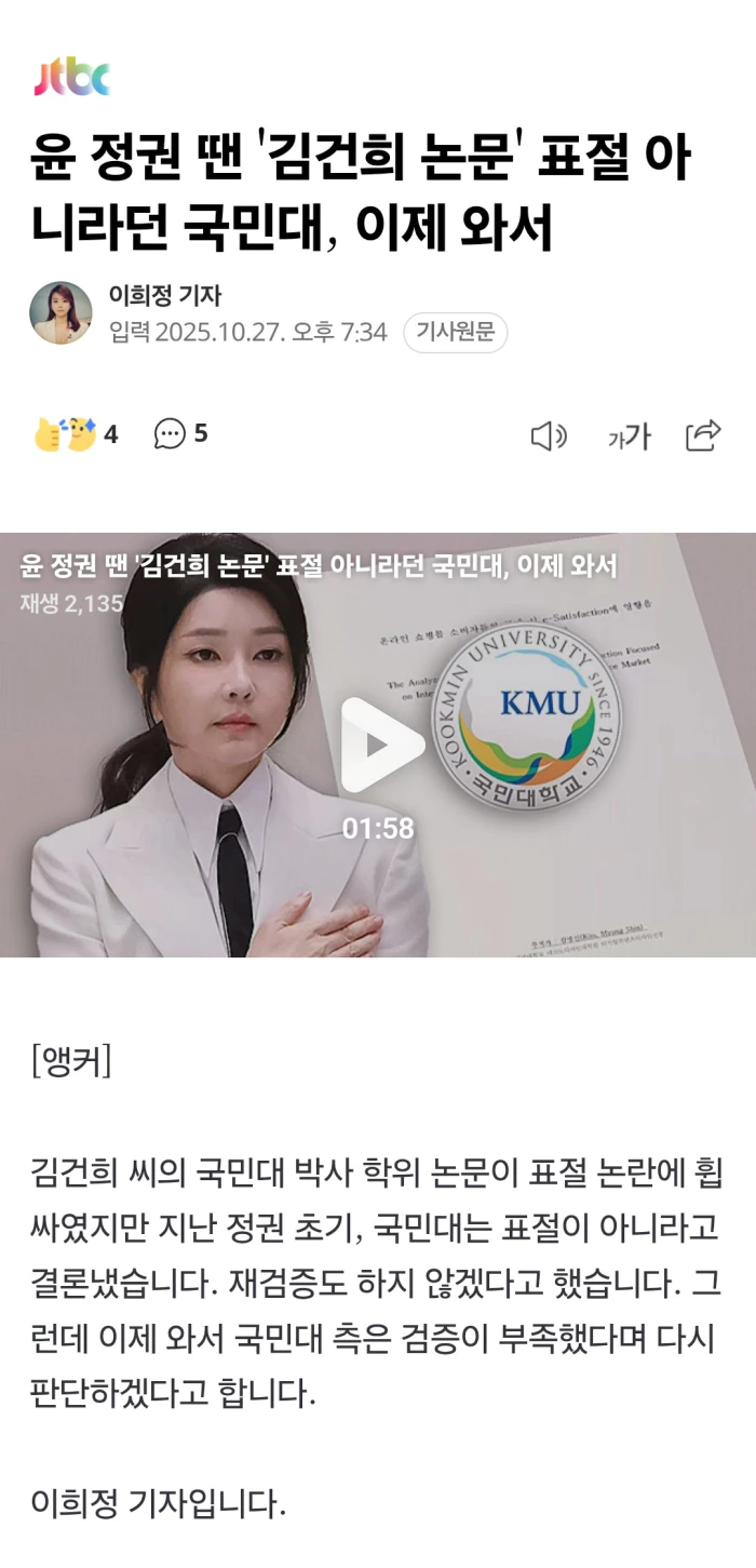 [기자] 김건희 씨는 2008년 국민대학교에서 '아바타를 이용한 운세 콘텐츠 개발 연구' 논문으로 박사 학위를 받았습니다. 대선 전 표절 의혹이 제기됐지만, 윤석열 정부 출범 후인 2022년 8월, 국민대는 해당 논문에 대해 "연구 부정 행위가 아니"라고 결론 냈습니다. 그런데 김 씨의 석사 논문을 검증했던 신동순 숙명여대 교수가 이 논문의 표절률이 32%가 넘는다고 발표했습니다. [신동순/숙명여대 교수 : 전체 논문 134페이지 중에서 3분의 1에 해당하는 44페이지에 대한 표절률만으로 30%가 넘으니 1장과 2장 내용은 거의 대부분 표절이라고 보면 됩니다.] 특히 일부는 온라인상의 글과 유료 지식거래사이트 등에서 인용 표기 없이 그대로 가져왔다고 지적했습니다. 국회 교육위원회와 교수들로 구성된 국민검증단 등은 국민대의 재검증 위원회 구성과 사과를 촉구했습니다. 국민대 졸업생들의 비판도 쏟아졌습니다. [김준홍/국민대 민주동문회 비대위원장 : 가장 안정적이고 권위적 지위를 가졌지만 보장된 독립 권한조차 스스로 포기한 (국민대) 연구윤리위원회, 그리고 단순 의견조차 내기를 반대한 60% 교수들이야말로 이번 사태에서 큰 책임을 느껴야…] .. 후략 ..