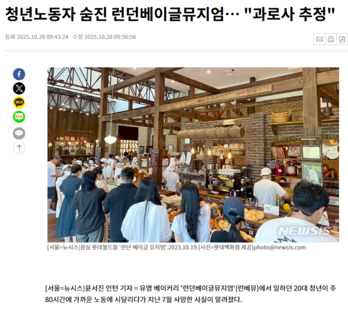 "런베뮤에서 일하던 20대 청년이 주당 58시간에서 80시간에 달하는 과로에 시달리다가 지난 7월 숨졌다는 사실이 보도됐다"며 "작년 5월 입사 후 14개월 만이다"고 밝혔다. 이어 "사망 전날에는 아침 9시에 출근해 자정 직전에 퇴근했다. 사망 닷새 전에는 21시간 일하기도 했다"며 "이처럼 갑자기 근로시간이 늘어나면 과로 가능성도 높아진다. 만성 과로와 급성 과로가 겹쳐 과로사로 이어진 것 아닌지 추정되는 대목"이라고 언급했다. 또 "고인의 근로계약서는 주14시간 이상 초과근로를 기준으로 작성되어 주 52시간 상한제를 위반하고 있고, 실제 근무 시간은 이보다도 훨씬 길다"며 "입사 후 14개월간 거쳐온 지점은 4곳이나 된다. 강남에서 수원으로, 다시 인천으로 옮겨 다니면서 근로계약서만 세 번 갱신했다"고 덧붙였다. 정의당에 따르면 고인의 유족은 산재를 신청했지만, 런베뮤 운영사 LBM 측은 근로시간 관련 자료 제공을 거부하며 "회사가 확인한 근무 기록은 유족 주장과 다르다"는 입장을 반복하고 있다. LBM의 고위급 임원은 산재를 신청하겠다는 유족에게 "굉장히 부도덕해 보인다"고 폭언을 하기도 한 것으로 전해졌다. 진보당 이미선 대변인도 이날 '청년 핫플레이스 런던베이글뮤지엄, 실상은 청년의 노동과 목숨을 갈아넣은 기만 기업이었나'라는 제목의 논평을 올렸다. 이 대변인은 "고인은 사망 전날 끼니도 거르며 15시간 넘게 일했고, 사망 직전 주간의 노동시간은 이전 12주 평균보다 37%나 증가했다"며 "유족이 산재를 신청했지만 런베뮤 사측은 과로사를 부인하며 근로시간 입증 자료조차 제출하지 않고 있다"고 지적했다. .. 후략 ..