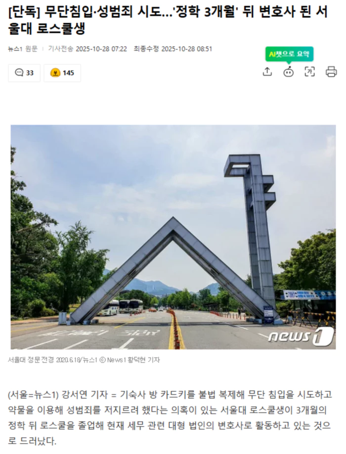 28일 국회 교육위원회 소속 정을호 더불어민주당 의원실에 따르면 서울대 로스쿨에선 불법 촬영과 음란물 배포, 성 비위 등 부적절한 사건들이 연이어 발생해 온 것으로 나타났다. 지난해 5월 '서울대 N번방 사건'에서 로스쿨 졸업생 강 씨는 피해자 수십 명의 사진을 딥페이크로 합성·유포해 현재 2심에서 징역 3년 6개월을 선고받은 상태다. 학내에서 연속적으로 성 비위 행위를 시도하고 저지른 로스쿨생은 가벼운 징계만 받은 채 변호사 자격을 취득해 대형 법인에 취업한 사례도 있었다. A 씨는 2021년 10월에 대학원 생활관에 거주하는, 평소 알고 지내던 여학생의 기숙사 방 카드키를 불법 복제해 무단 침입하려다 적발된 것으로 알려졌다. 이후 이에 대한 책임과 처벌은 없었고 기숙사 영구퇴거 조치가 전부였던 것으로 파악됐다. A 씨는 2023년에는 교환학생을 온 동료 여학생을 상대로 케타민 추정 약물 사용이 의심되는 성 비위 사건을 저질러 학교에 신고됐다. A 씨는 의식이 혼미한 피해자를 모텔로 데려갔지만, 단순한 성희롱으로 유기정학 3개월 징계만 받은 것으로 확인됐다. 의원실에 따르면 A 씨는 로스쿨을 정상적으로 졸업하고 2025년 변호사 자격을 취득해 현재 세무 관련 대형 법인의 변호사로 취직까지 했다. A 씨를 변호사로 채용한 회사는 성 비위 전력을 전혀 모르고 있는 것으로 확인됐다. .. 후략 ..