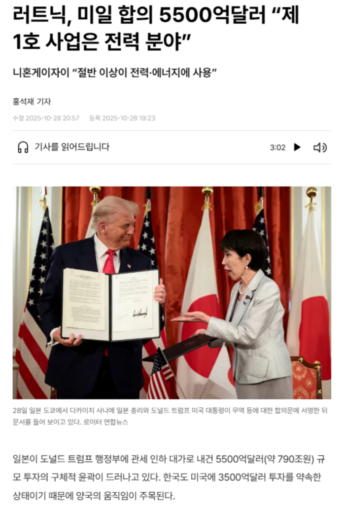 일본과 관세 협상을 주도했던 하워드 러트닉 미국 상무장관은 “올해 안에 첫 사업이 결정될 것”이라며 세부 일정을 못박았다. 그는 트럼프 대통령과 다카이치 사나에 일본 총리의 정상회담이 열린 28일 니혼게이자이신문에 보도된 인터뷰에서 5500억달러 투자처와 관련해 “미·일 경제 안보를 위한 공동 투자로 제 1호 사업은 전력 분야”라고 말했다. 생성형 인공지능(AI) 발전 등에 따른 전력 수요를 충당할 미국 발전시설 투자가 필요하다는 것이다.