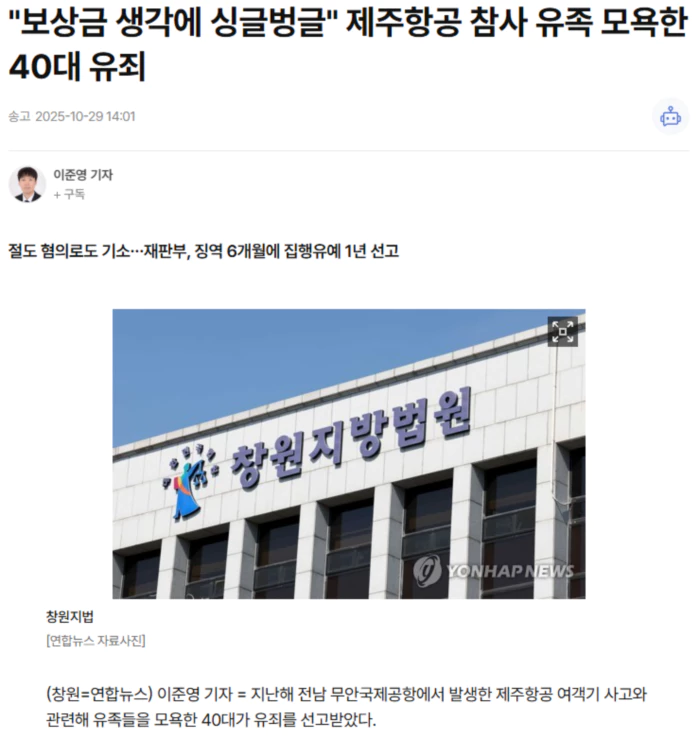 그는 '무안공항 유가족들만 횡재네요'라는 제목으로 '보상금 받을 생각에 속으로는 싱글벙글일 듯'이라는 글을 적었다.