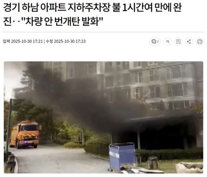 오늘(10/30) 오후 3시 10분쯤 경기 하남시 망월동에 있는 한 아파트 지하1층 주차장에서 불이 나 1시간여 만에 꺼졌습니다.