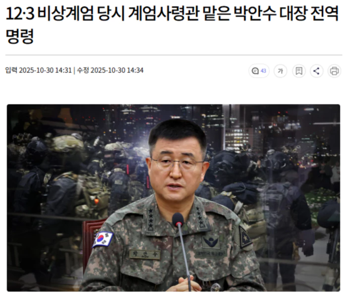 12·3 비상계엄 사태 당시 계엄사령관을 맡아 포고령을 발표한 박안수 육군참모총장이 오늘(10/30) 전역했습니다.