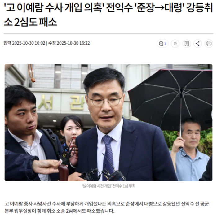 서울고법 행정3부는 전 전 실장이 국방부장관을 상대로 낸 징계 처분 취소 소송에서 "정당한 이유 없이 군 검사에게 면담을 강요한 점이 품위 유지의무를 위반했다"며 "징계사유에 해당한다"고 판단했습니다.