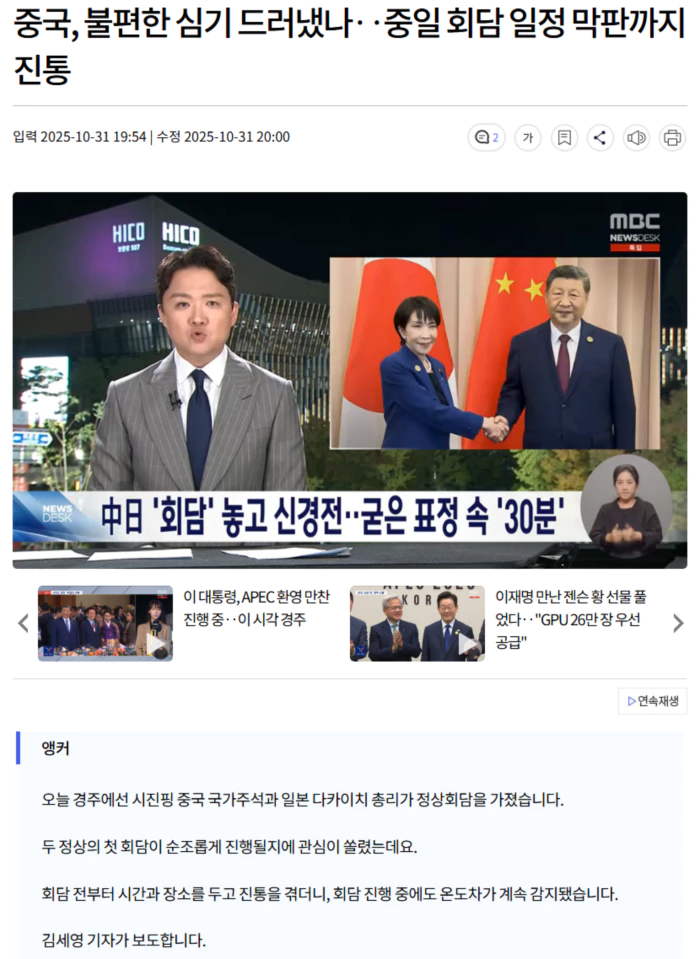 다카이치 총리의 취임 열흘 만에 이뤄진 시 주석과의 첫 정상회담.