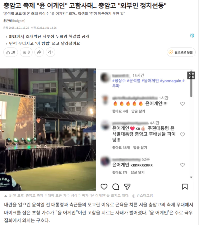 사회관계망에서 해당 동영상이 급속도로 퍼지며 "역시 내란 명문고"라는 비판 목소리가 나오고 있다. 이 학교 교장은 <오마이뉴스>에 "당시 무대에 올라간 외부인의 정치 선동이며, 법적 대응을 검토하고 있다"라고 밝혔다. - 학생들 앞에서 "윤 어게인" 두 번 외친 정상수 1일, <오마이뉴스>는 지난 10월 31일 오후 8시 30분쯤, 충암고 학생회가 주최한 '충암제' 동영상을 살펴봤다. 충암중 운동장에서 벌인 이번 축제에는 충암고 학생 800여 명과 이 학교 주변에 있는 타학교 학생 200여 명 등 모두 1000여 명이 참석했다고 한다. 무대에 오른 래퍼 정상수씨는 한 학생을 무대에 오르게 해 '충암고의 자랑'을 물어본 뒤, 이 학생이 '윤석열'이라고 나지막하게 답하자 "와 진짜, 나도 해버려? 에이 셧업 모르겠다"라고 말한 뒤 다음처럼 두 차례 외쳤다. "윤 어게인!" 이런 고함 소리가 나오자, 무대 주변에 있던 충암고 학생회 소속 학생들로 보이는 이들은 서둘러 일어나 자리를 뜨는 등 당황하는 모습을 보였다. 내부 회의를 열기 위해서인 것으로 보인다. 이 같은 사태에 대해 이윤찬 충암고 교장은 <오마이뉴스>와 통화에서 "충암고 학생회 초청 래퍼의 돌발적인 정치 선동이 학교 축제 현장에서 벌어진 것에 대해 당혹감을 감출 수 없다"라면서도 "당시 함성을 지른 래퍼는 충암고 학생회에서 초청한 가수지만, 그가 이런 고함을 지를 줄은 몰랐다. 당시 무대에 있던 학생은 충암고 학생이 아닌 충암고 주변 다른 고교 학생으로 확인했다"라고 설명했다. .. 후략 ..
