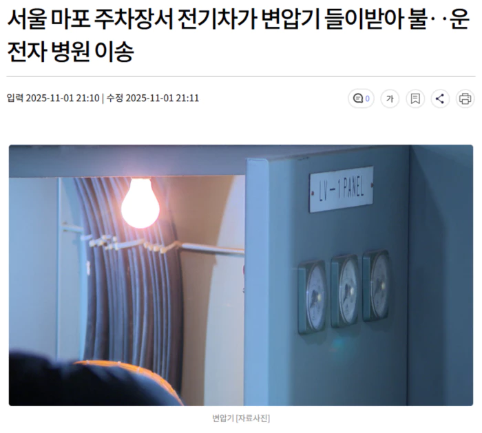 오늘(11/1) 오후 6시쯤 서울 마포구 합정동의 공영주차장에서 전기차가 변압기를 들이받는 사고가 났습니다.