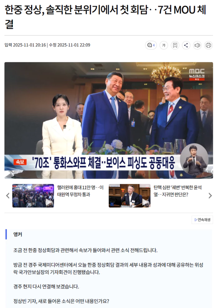 네, 말씀하신 것처럼 오늘 이재명 대통령과 시진핑 주석은 7건의 양해각서 MOU를 체결했습니다.