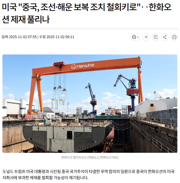 앞서 중국은 한화오션의 미국 자회사 5곳이 미국무역대표부의 '무역법 301조' 조사에 협력했다는 이유로 관련 회사들을 제재 목록에 올린 바 있습니다.