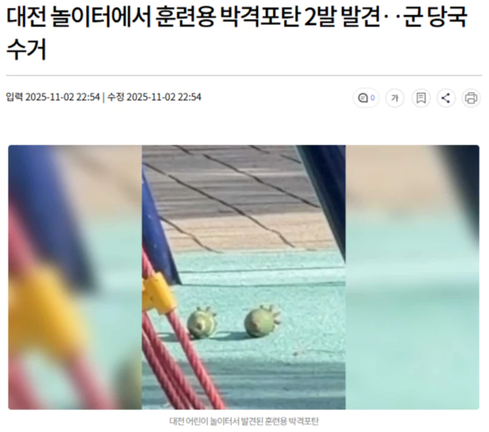 오늘(11/2) 낮 2시쯤 대전 유성구의 한 어린이 놀이터에서 포탄으로 보이는 물체가 있다는 경찰 신고가 접수됐습니다.