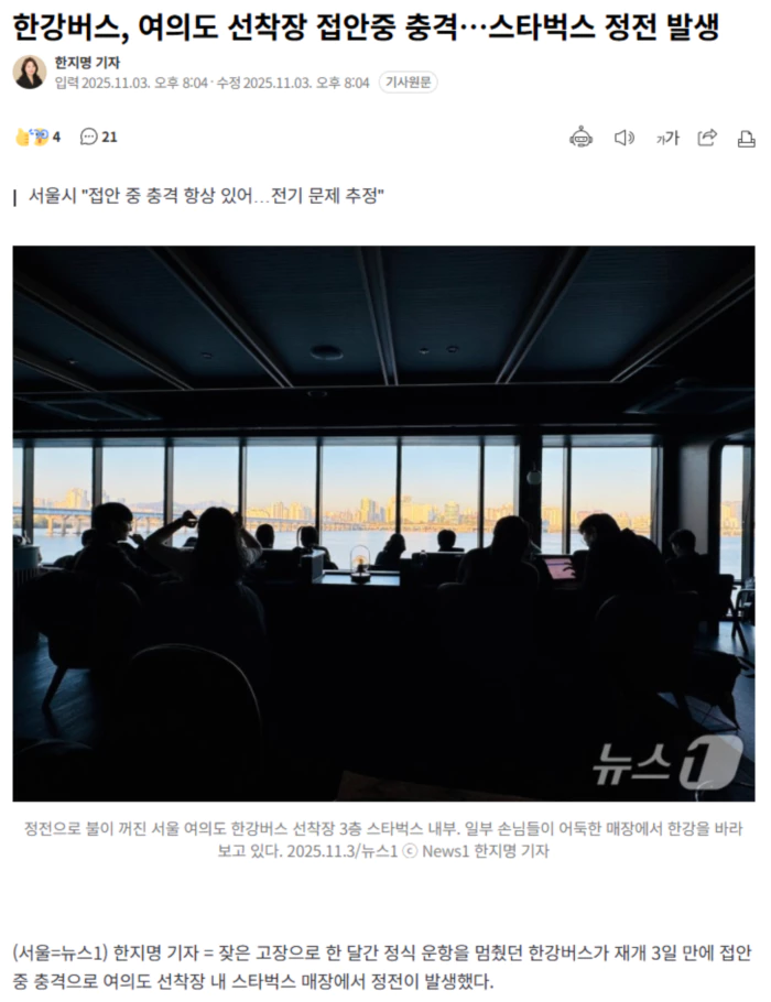 3일 서울시와 여의도 선착장 스타벅스 등에 따르면 이날 오전 11시50분쯤 선착장에 접안하던 한강버스 선박의 충격으로 3층 스타벅스 매장 내 스위치 일부가 작동하지 않아 내부 조명 전원이 꺼졌다. 스타벅스 측은 오후 2시30분쯤 수리 업체에 신고를 접수했다. 이후 오후 6시30분쯤께 매장 전체의 약 3분의 2가량 전원은 복구됐으나, 한강이 보이는 창가 쪽 조명 일부는 영업 종료 후 복구할 예정이다. 서울시 관계자는 "선착장은 충격방지용 방현재(고무 완충재)가 설치됐으나, 접안용 줄을 당기는 과정에서 평소보다 충격이 컸던 것으로 보인다"며 "선착장과 선박이 직접 부딪친 것은 아니고 방현재를 통해 완충이 이뤄졌다"고 말했다. 이어 "접안 과정에서 충격이 전혀 없을 수는 없으며, 방현재 접촉 시 일정 수준의 충격은 항상 있다"고 했다. 시는 이번 사례를 매장 내부 인테리어 전기라인 문제로 추정하고 있다. 시 관계자는 "사고가 컸다면 입점 점포(CU·BBQ 등)에도 이상이 있었겠지만, 그런 사례는 없었다"며 "정확한 원인을 파악 중"이라고 전했다. .. 후략 ..