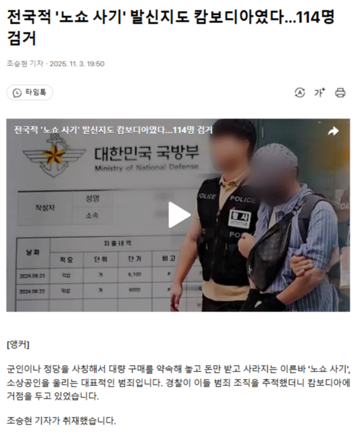 [기자] 자신을 현역 장교라고 소개한 남성이 철물점에 전화해 전투식량을 대신 사달라고 부탁합니다. ['노쇼 사기' 범죄 조직원 : 기존에 저희 거래 받고 있던 거래처에서 오늘 배송은 안 된다고 해서…] 남성은 앞서 부대에 필요하다며 삽과 곡괭이를 대량 주문한 상태였습니다. 철물점 사장은 남성이 알려준 업체에 주문을 넣고 1440만 원을 보냈습니다. [피해자-범죄 조직원 통화 : 즉석 이런 것은 또 처음이라서 저도… {아 그래요? 다른 업체들이 많이 이용하고 하세요.}] 결제 확약서까지 받고 안심했는데 이른바 '노쇼 사기'였습니다. 군부대에 대통령 경호처, 지난 5월 대선을 앞두곤 정당까지 사칭했습니다. 전국 '노쇼 사기'를 집중 수사해 온 강원경찰청은 지난해 12월부터 지금까지 560건을 적발했습니다. 확인된 피해액만 69억 원입니다. 사기 전화를 걸어온 범죄 조직의 콜센터는 캄보디아 시아누크빌의 범죄 단지에 있었습니다. 캄보디아 경찰과 인터폴, 국정원이 현지 콜센터를 급습해 114명을 검거했고, 이 가운데 20대 국내 총책 등 18명이 구속됐습니다. 대부분 20~30대 청년이었습니다. .. 후략 ..
