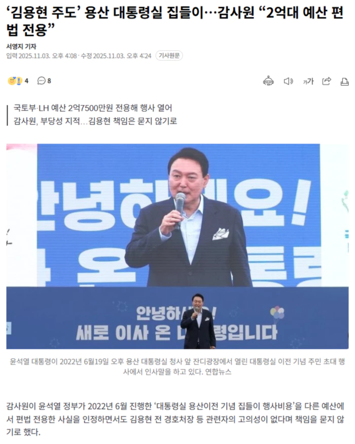 감사원은 3일 ‘대통령실 집들이 행사 및 용산 어린이정원 위탁업체 선정 의혹에 대한 국회감사요구’에 대한 감사결과를 발표하며 이런 내용을 공개했다. 앞서 국회는 2022년 6월 국토교통부가 윤석열 정부의 대통령실 집들이 행사 비용을 용산공원 예산으로 편법 전용한 의혹과 용산 어린이정원 위탁관리업체 선정 과정에 특정 업체를 밀어준 의혹이 있다며 감사를 요구한 바 있다. 윤 전 대통령은 취임 직후인 2022년 6월19일 청와대에서 용산 대통령실로 집무실을 이전한 것을 기념해 ‘안녕하세요! 새로 이사 온 대통령입니다’라는 이름으로 집들이 행사를 했다. 행사에는 인근 지역 주민과 어린이, 소상공인 등 400여명이 참석했고 예산은 2억7천여만원이 소요됐다. 감사원은 대통령실이 집들이 행사 비용을 다른 예산에서 편법·위법으로 전용했다고 판단했다. 감사 결과를 보면, 김용현 전 처장은 2022년 5월 대통령실 집들이 행사를 준비하라는 윤 전 대통령 지시에 따라 경호처 내에 비공식 임시조직단을 신설해 행사를 준비하도록 했다. 임시단의 업무 범위에 대통령 경호업무 범위를 벗어난 ‘용산공원 홍보’ 등 업무를 포함했고, 나이가 많아 경호처 직원으로 임용할 수 없는 자신의 육군사관학교 동기를 기간제 근로자로 채용해 단장으로 앉혔다. 감사원은 또 해당 행사(대통령실 집들이)의 주관기관과 행사, 목적, 장소, 참여자, 운영 방식 등을 종합적으로 고려할 때 용산공원 시범개방 행사와 별개의 행사로 보는 게 합리적이라며 “그런데도 국토부와 엘에이치(LH)는 용산공원법에 따라 용산공원 임시 개방사업을 위해 배정된 위·수탁 사업비 예산을 대통령실 집들이 행사 개최 비용(2억7500만원)으로 지급했다”고 지적했다. 감사원은 당시 행사의 부당성을 인정하면서도 김용현 전 처장 등에 대한 책임은 묻지 않았다. 감사원은 “윤 전 대통령의 지시에 따라 김용현 전 처장이 직원들에게 지시한 점은 확인되지만 김용현 전 처장 등이 용산 반환부지 조성 예산으로 해당 행사를 집행한 사실을 인지한 것으로 확인되지 않는다”고 밝혔다. 이어 감사원은 “두 행사 간의 장소와 시기적 인접성, 용산공원 시범개방행사 콘텐츠에 대통령실 앞뜰 방문 프로그램이 포함된 점, 용산공원 시범개방행사 기획 과정에서 대통령실 집들이 행사가 추가됐던 점 등을 고려하면, 이 건 관련자들이 법령 위반의 고의성을 가지고 있었다고 보기 어려워, 개인에게 책임을 묻기는 어렵다”고 판단했다. 감사원은 용산공원 임시개방 관리운영 대행업체를 선정하는 과정에서 특정 업체를 밀어주기 했다는 의혹에 대해서는 특별한 문제점을 발견할 수 없다고 밝혔다. 다만 감사원은 엘에이치(LH)가 계약이행 과정에서 상당수 과업을 직접 수행하지 않고 사전 승인 없이 하도급을 하거나 부적정한 원가 정산을 통해 대금을 과다 지급받았음에도 이를 인지하지 못하는 등 관리·감독을 소홀히 했다고 지적했다. .. 후략 ..