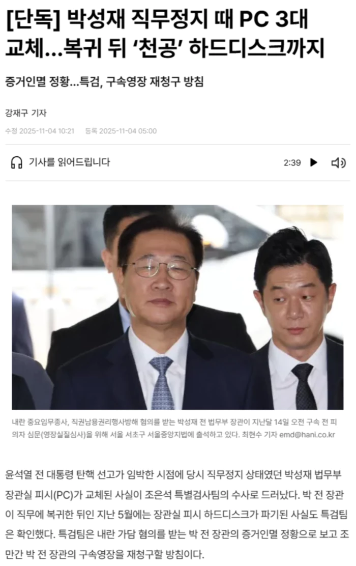 3일 한겨레 취재 결과, 특검팀은 윤 전 대통령 탄핵 선고(지난 4월4일)가 임박한 지난 3월 법무부 장관실 피시 3대가 교체된 정황을 확인했다고 한다. 지난해 12월12일 국회의 탄핵소추안 통과로 당시 박 전 장관은 직무정지 상태였으며, 장관 부재 상황에서 누군가의 지시로 돌연 장관실 피시가 교체된 것이다. 박 전 장관은 윤 전 대통령 탄핵 뒤인 올해 4월10일 헌법재판소의 탄핵소추안 기각으로 장관직에 복귀했다. 이어 올해 5월께 전문업체는 법무부 장관실 피시의 하드디스크를 천공(구멍을 뚫음) 방식으로 파기한 사실도 특검팀은 파악했다. 윤 전 대통령의 파면 결정 전후에 법무부 장관실의 피시가 교체되고 하드디스크가 훼손된 셈이다. 특검팀은 이런 작업이 박 전 장관의 지시에 따른 것이라고 의심한다. 특검팀은 박 전 장관이 비상계엄 선포 뒤 경기도 과천시 정부과천청사 장관실에서 대기한 정황으로 미뤄볼 때 교체된 장관실 피시에 그가 계엄 관련 검토 문건이나 검색 기록 등이 다수 남아 있었을 것으로 보고 있다. 박 전 장관은 계엄 선포 당일 밤 11시30분 무렵부터 30분가량 정부과천청사에서 국·실장 회의를 진행한 뒤 이튿날 새벽 4시27분 대통령실에서 열린 계엄 해제 국무회의 참석하기 전까지 장관실에서 줄곧 머무른 것으로 알려졌다. .. 후략 ..
