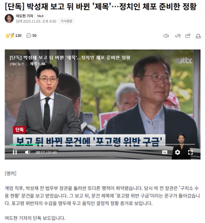 그런데 JTBC 취재결과 이 문건은 박 전 장관에게 보고된 이후 제목이 바뀌었는데, 바뀐 제목에 '포고령 위반 구금'이라는 단어가 들어간 것으로 확인됐습니다.