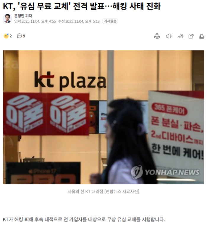 KT는 오늘(4일) 이사회를 열어 전 고객을 대상으로 한 유심 교체 실시를 의결했다고 밝혔습니다. 이는 2만2,227명이 불법 초소형 기지국(펨토셀) 불법 접속에 노출되고 362명이 무단 소액결제를 당하는 등 해킹 피해가 일어난 KT에서 국제이동가입자식별정보(IMSI), 국제단말기식별번호(IMEI) 등 일부 개인정보가 유출된 것이 확인되며 가입자 불안이 커진 데 따른 후속 조치입니다. 가입자 전원의 개인정보가 유출된 정황은 확인되지 않았지만, 일부 가입자 정보 유출과 소액결제라는 금전적 피해가 일어난 것은 KT가 관리하는 핵심 서버망에서 해킹이 이뤄졌기 때문이라는 의혹이 수그러들지 않자 고객 보호 조치에 나선 것입니다. KT는 내일(5일) 오전 9시부터 KT닷컴 홈페이지를 통해 접수한 고객을 대상으로 유심 무상 교체 서비스를 시작합니다. 유심 교체를 희망하는 고객들을 KT닷컴 또는 유심교체 전담센터(080-594-0114)를 통해 예약 후 전국 KT 대리점에서 유심을 교체할 수 있습니다. 대리점 방문이 어려운 고객을 위해 이달 11일부터는 택배 배송을 통한 셀프 개통 서비스도 운영합니다. KT는 시행 초기 신청이 집중될 가능성을 고려해, 피해 발생 지역(광명·금천 등)을 우선 대상으로 교체를 진행하고 이후 수도권 및 전국으로 단계적 확대할 예정입니다. .. 후략 ..