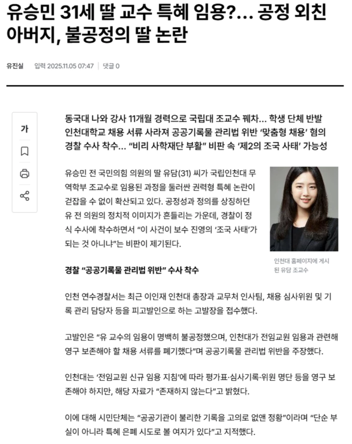 - 31세 초임 교수, 강사 11개월로 전임 임용 유담 씨는 동국대 경영학 학사·연세대 석사·고려대 박사를 마치고, 2022년 9월부터 2023년 8월까지 고려대 경영대학에서 11개월간 강사로 근무한 것이 전부인 경력이다. 그 외에는 박사후연구원(Postdoc) 6개월 경력이 전부로 통상 국립대 정교원 임용 기준과 비교하면 경력·연구 실적 모두 턱없이 부족하다는 지적이 많다. 인천대 무역학부는 최근 몇 년간 박사 후 5년 이상 경력자·해외 연구자·실무 경력자들이 탈락할 정도로 경쟁률이 높았다. 그런데 이런 상황에서 유승민 전 의원의 딸이 단숨에 정교원으로 발탁된 것은 “상식적으로 납득이 어렵다”는 평가가 학계 안팎에서 이어진다. - 논문 점수 ‘하위권’인데 1차 심사 ‘2위’ 국회 교육위원회 국정감사에서도 해당 논란은 핵심 쟁점으로 다뤄졌다. 더불어민주당 진선미 의원은 “유 교수는 논문 질적 평가에서 18.6점으로 16위였지만, 학력·경력·논문 양적 평가에서 만점을 받아 1차 심사를 2위로 통과했다”고 지적했다. 유 교수가 해외 유학이나 산업 경력도 전무한데 ‘경력 만점’을 받은 점은 심사 기준 자체가 ‘맞춤형 평가’로 조정된 것 아니냐는 의혹을 낳고 있다. 특히 임용 직전 발표된 논문 상당수가 영향력이 낮은 학술지에 게재된 것으로 확인돼, “임용을 위한 스펙용 논문”이라는 비판도 피하기 어렵다. - 인천대 “공정했다” 해명에도… “기록이 없는데 공정?” 인천대 측은 “모든 절차를 내부 기준에 따라 공정하게 진행했다”며 특혜 의혹을 부인했다. 하지만, 핵심 채용 문서가 사라진 상황에서 ‘공정했다’는 주장은 설득력을 잃었다. 고발인은 “문서가 없다는 건 결국 증거 인멸과 다름없다”며 “국립대가 이런 식으로 채용을 진행한다면 대한민국 공교육의 신뢰는 무너진다”고 말했다. 이에 대해 경찰 관계자는 “고발 내용의 사실관계를 확인 중이며 필요시 총장 및 관련자들을 소환 조사할 방침”이라고 밝혔다. - “비리 사학의 대명사” 인천대, 과거의 그림자 되살아나 이번 사태는 인천대의 과거와 겹쳐지며 비판 여론을 더욱 자극한다. 1990~2000년대 초 인천대는 교수 채용 금품수수·친인척 특혜·회계 비리 등으로 교육부 감사와 검찰 수사를 받았다. ‘비리 사학의 대명사’라는 오명을 쓴 끝에 2013년 국립대로 전환됐지만, 불과 10년 만에 다시 권력형 특혜 의혹으로 신뢰 위기에 직면한 것이다. 교육계에서는 “국립대 전환 후에도 학교 내부에 정치권 인맥이 뿌리내려 있다”며, “이번 사건은 인천대가 여전히 과거의 폐습을 벗어나지 못했음을 보여준다”고 평가했다. - “공정 외친 아버지, 그 잣대는 기족부터 적용돼야” 유승민 전 의원은 정치인 시절 “공정·정의·상식”을 대표 슬로건으로 내세워 청년층의 지지를 받았다. 그러나 이번 사태로 인해 그가 외친 ‘공정’이 결국 특권층을 위한 수사(修辭)였던 것 아니냐는 역풍이 불고 있다. 인천대 학생 단체 ‘공정 임용을 위한 학생들’은 기자회견에서 “국립대 교수직이 정치인의 가족에게 돌아가는 현실은 정의의 붕괴”라며 “임용 전 과정을 투명하게 공개하라”고 촉구했다. 학생들은 “이 사건은 개인의 채용 문제가 아니라, 우리 사회가 진정으로 공정한가를 묻는 시험대”라고 비판했다. - “제2의 조국 사태 될 수도”… 권력형 위선의 민낯 전문가들은 이번 사건이 ‘보수권의 조국 사태’로 번질 수 있다고 경고한다. 한 대학 교수는 “조국 전 장관이 자녀 입시 문제로, 유승민 전 의원은 자녀 임용 문제로 공정성 논란에 휘말렸다”며 “진보와 보수를 막론하고 권력이 교육 기회를 왜곡하는 구조는 똑같다”고 꼬집었다. .. 후략 ..