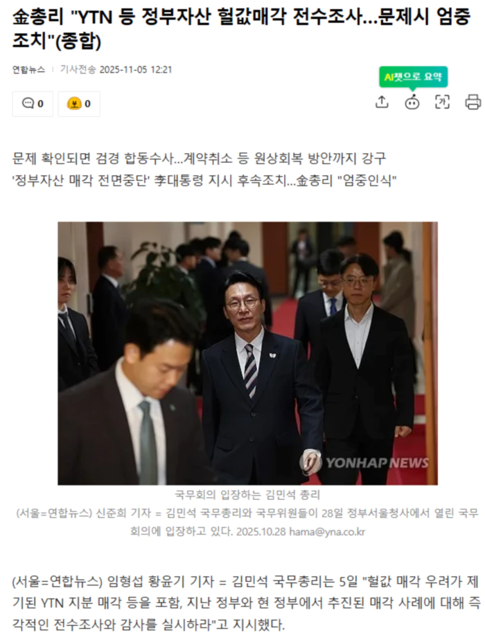 김 총리는 이날 오전 이재명 대통령의 '정부 자산매각 전면 중단' 지시사항에 대한 후속 조치 상황을 보고 받은 뒤 이런 긴급 지시를 했다고 총리실이 밝혔다.