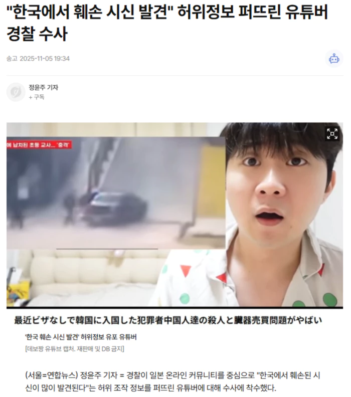 경찰청은 5일 언론 공지를 내고 서울경찰청 사이버수사대가 해당 유튜버에 대해 신속하게 수사에 착수하도록 조처했다고 밝혔다. 경찰이 수사에 착수한 유튜버는 96만 구독자를 보유한 '데보짱'으로 알려졌다. 일본에서 활동하는 한국인 유튜버로 알려진 데보짱은 지난달 22일 '최근 비자 없이 한국에 입국한 범죄자 중국인들의 살인과 장기 매매 문제가 심각하다'는 제목의 유튜브 영상을 올렸다. 그는 영상에서 '한국 내 하반신만 있는 시체가 37구 발견됐다. 비공개 수사 중인 사건만 150건이다'라는 내용의 확인되지 않은 허위 정보를 주장했다. 경찰청은 "이 행위를 중대 범죄로 인식하고 있다"며 "사실관계를 정확하게 파악한 뒤 관련 법령에 따라 조처할 예정"이라고 했다. 경찰은 이 유튜버의 국적 및 소재지 등을 확인할 방침이며 전기통신기본법 위반 혐의 적용 등을 검토하고 있다. 경찰은 이 유튜버의 허위조작정보 유포 행위가 국민 불안감을 조성하고 사회 혼란을 초래하며 한국의 국가 이미지를 훼손한다고 판단했다. .. 후략 ..