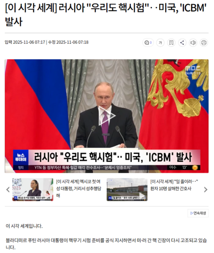현지시간 5일, 블라디미르 푸틴 대통령이 외무부와 국방부 등 관련 기관에 핵무기 시험 준비 제안서를 제출하라고 지시했습니다.