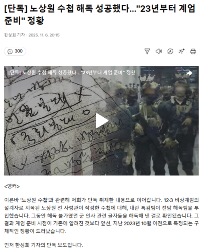 <기자> 12·3 비상계엄 이후 내란 중요임무 종사 혐의로 구속된 노상원 전 정보사령관이 작성한 수첩입니다. 그간 지난해 4월 총선 이전 작성된 것으로 추정했었는데, 내란 특검팀이 구체적 작성 시점을 이보다 앞선 2023년 10월 이전으로 특정한 걸로 SBS 취재 결과 확인됐습니다. 그동안 판독 불능이던 수첩의 한 페이지를 특검팀이 해독한 겁니다. 여인형 화살표 소형기, 박안수 김흥준, 그 아래에 손식 등 이름이 확인된 건데, 이들 모두 2023년 10월 전후 진급 또는 인사 대상자였습니다. 여인형은 2023년 11월 중장 진급해 방첩사령관으로, 소형기는 같은 시기 방첩사 2인자로 진급했고, 계엄사령관이던 박안수는 2023년 10월 대장 진급과 동시에 육군참모총장, 김흥준은 육본 참모부장으로 임명됐습니다. 손식도 같은 시기 대장으로 진급해 지상작전사령관이 됐습니다. 손식 바로 아래 적힌 '강은 차후'라는 글자는 '강호필은 차후 진급'시킨다는 뜻으로 특검은 결론 내렸는데, 손식 대장의 육사 47기 동기인 강호필은 실제 이듬해인 2024년 대장으로 진급해 후임 지상작전사령관이 됐습니다. 현재까지 여인형, 박안수 외에 나머지 장성들과 비상계엄의 연관성은 확인되진 않았습니다. 하지만, 특검은 수첩 내용을 토대로 노 전 사령관이 최소한 비상계엄 1년 3개월 전인 2023년 10월 이전부터 수첩을 작성해가며 계엄 준비를 한 것으로 강하게 의심하고 있습니다. 특히 같은 페이지에 적힌 "별표 역행사 대비, 민주당 쪽, 9사단, 30사" 단어도 이를 뒷받침한다고 특검은 보고 있습니다. .. 후략 ..