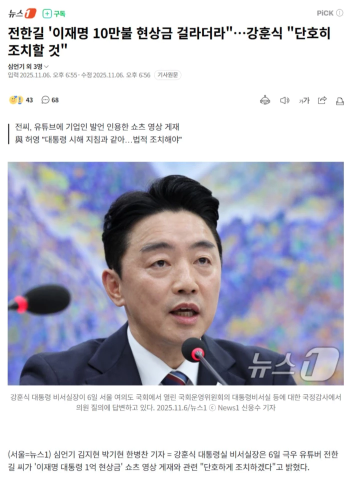 강 비서실장은 이날 오후 국회 운영위원회 국정감사에서 허영 더불어민주당 의원이 전 씨의 유튜버 영상 게재를 문제삼으며 "미 당국과 협의해 체포해서 처벌해야 된다고 생각한다. 단호하게 조치하겠느냐"고 묻자 이같이 말했다.