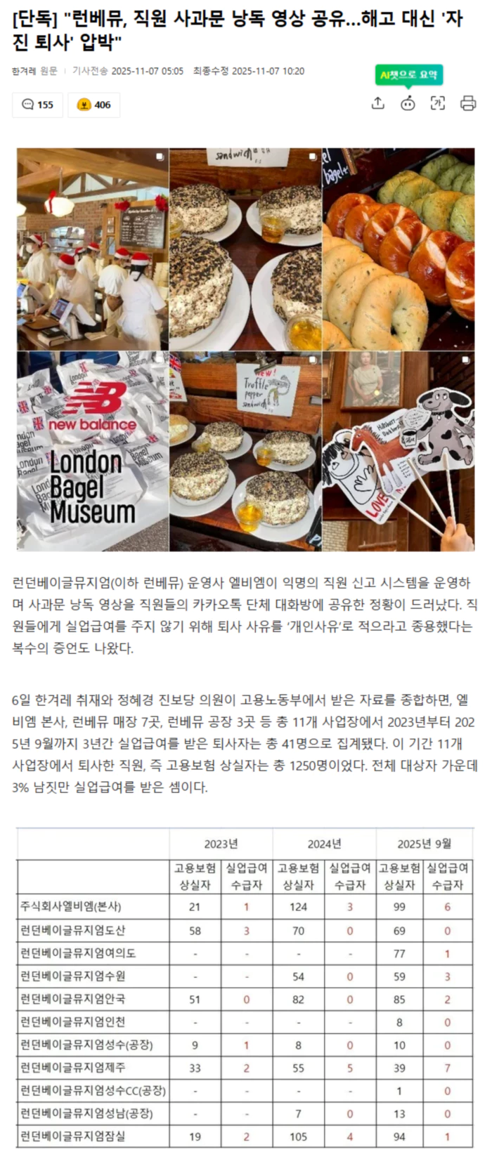 엘비엠의 고용형태 공시를 보면, 전체 노동자 750명 가운데 726명이 기간제 노동자다. 고용보험법상 피보험단위기간(근로일+주휴일)이 180일 이상이고, ‘비자발적 퇴사’일 경우 실업급여 수급 대상이 된다. ‘계약기간 만료’로 퇴사하게 될 경우 실업급여를 받을 수 있다는 의미다. 장종수 노무사(직장갑질119 온라인노조 사무처장)는 “기간제 비율이 약 97%에 달하는데, 실업급여 수급자 수가 5%도 되지 않는다는 것은 상식적으로 이해가 되지 않는다”고 했다. 이 배경에는 엘비엠 쪽의 압박이 있었던 것으로 보인다. 런베뮤에서 팀장급으로 일했던 ㄱ씨는 “일에 서툰 직원이 있어서 해고하려고 하자, 엘비엠 서비스운영본부 쪽에서 ‘면담 후 자진퇴사하겠다는 말을 받아내라’는 지시를 받았다”고 말했다. 다른 직원 ㄴ씨는 “과로로 몸이 아파 실업급여를 문의했는데 회사 쪽에 불이익이 있다며 안 된다고 했다”며 “상급자가 자진퇴사로 유도해서 주변에서도 실업급여를 받은 직원을 본 적 없다”고 말했다. 엘비엠은 일부 사업장에서 고용지원금을 받은 사례가 있었는데, 권고사직 등으로 인위적 감원을 할 경우 지원금을 반환하는 등 불이익을 받기 때문에 자진퇴사를 유도한 것으로 추정된다. 한편 엘비엠에서 익명의 신고 시스템을 운영하고, 해당 시스템에 신고가 접수된 직원이 사과문을 읽는 영상을 카카오톡 단체 대화방에 올려 직원들에게 공유했다는 정황도 나왔다. 정혜경 의원에 따르면, 렌즈서비스라고 불리는 ‘익명의 소통 채널’에 제보가 접수되면 본사는 대상 직원에게 아침조회 시간에 사과문을 낭독하도록 했다고 한다. 한 사과문 낭독 동영상에 대해 정아무개 엘비엠 이사가 “전 지점, 사원, 직급자 모두 좋은 문화 정착을 위해 다같이 진중하게 들여다 보라”는 평가를 남기기도 했다. 전 지점 직원이 볼 수 있는 단체카톡방에 공유됐을 가능성이 높은 정황이다. .. 후략 ..
