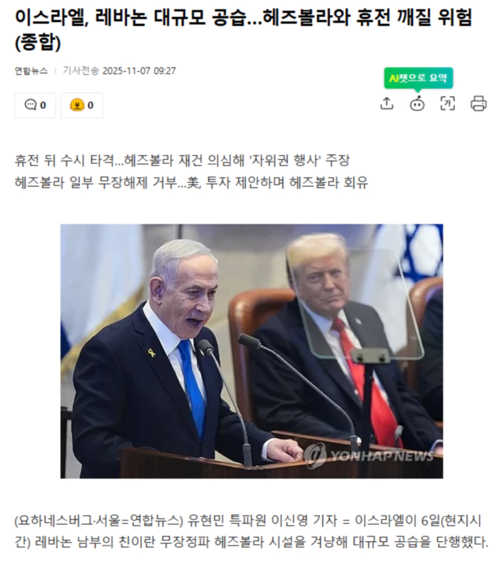이스라엘은 지난해 11월 헤즈볼라와 휴전에 합의했지만, 이후로도 산발적인 군사작전을 계속해온 데다 최근에는 공습 강도가 격화하고 있어 휴전이 깨지는 것 아니냐는 우려를 낳고 있다. 타임스오브이스라엘과 파이낸셜타임스(FT) 등에 따르면 이스라엘군은 이날 레바논 남부 4개 마을에 대해 대피 경고를 발령한 이후 수 시간 만에 대규모 공습을 감행했다. 아비차이 아드라이 이스라엘군 아랍어 대변인은 앞서 엑스(X·옛 트위터)에서 레바논 남부의 건물 위치를 보여주는 지도를 공개하며 공습을 경고했다. 이스라엘군이 목표로 삼은 지역은 아이타 알자발, 타이베, 타이르 데바, 자우타르 알-샤르키야 등이다. 이스라엘군은 헤즈볼라가 이 지역에서 군사 역량을 재건하려 한다고 보고 군사 장비 생산 시설 등을 표적으로 삼았다고 밝혔다. 이번 공습에 따른 피해 규모는 아직 알려지지 않았다. 이스라엘과 헤즈볼라는 가자지구 전쟁이 발발한 이후 줄곧 대립해왔다. 헤즈볼라가 팔레스타인 무장정파 하마스를 지원한다는 명분으로 이스라엘을 공격하면서다. 피비린내 나는 교전 끝에 지난해 11월 휴전에 합의했지만, 이후로도 산발적인 공습은 끊이지 않았다. 다만 레바논에서 이스라엘군의 공습 전 대피 경고는 지난해 11월 휴전 합의 이후 비교적 드물었다. 마지막 경고는 레바논 남부 공습을 앞두고 지난 9월 18일 발령된 바 있다. 양측은 헤즈볼라의 무장해제를 놓고 갈등을 빚고 있다. FT에 따르면 헤즈볼라는 레바논 남부지역에서의 무장해제에는 반발하지 않고 있다. 하지만 휴전은 레바논 남부지역에만 적용된다는 입장을 고수하며 무장을 완전히 해제하라는 이스라엘과 도널드 트럼프 미국 행정부의 압박은 거부해왔다. 이에 베냐민 네타냐후 이스라엘 총리는 이주 초 내각 회의에서 "레바논이 헤즈볼라의 무장해제에 실패한다면 휴전 조건에 따라 자위권을 행사할 것"이라며 공격을 강화할 수 있다고 경고했다. 미국은 헤즈볼라가 무장을 해제하고 이란과 관계를 끊는다면 레바논 남부 개발사업에 중동 산유국이 투자를 할 수 있다며 '당근' 정책을 꺼내 들기도 했다. 반면 헤즈볼라의 입장은 아직 완고하다. .. 후략 ..