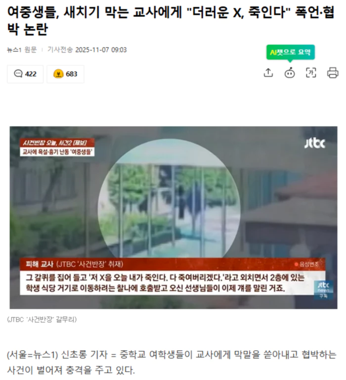 6일 JTBC '사건반장'에서는 지난달 16일 오후 서울의 한 중학교에서 여학생들에게 욕설과 협박을 받은 피해 교사의 인터뷰가 그려졌다. 이날 피해 교사는 급식실에서 급식 지도를 하면서 아이들 줄을 세우고 있었다. 학생들이 순서대로 줄을 서 있는데 문제의 여학생 2명을 포함한 중학교 3학년 학생 3명이 갑자기 불쑥 새치기했다. 교사가 학생들한테 "너희 몇 반이냐. 왜 새치기를 하냐"라고 물었다. 그러자 학생들은 순서가 지난 반의 이름을 댔고, 교사가 출석 번호를 묻자 "그건 모르죠"라면서 투명 인간 취급하며 교사를 지나쳤다. 교사는 "제가 손을 뻗어서 가이드를 잡아주고 있었다. 근데 그걸 무시하고 깔깔 웃으면서 나가더라. 제가 '어? 이렇게 가면 안 돼. 뒤로 가야 돼' 하면서 제 손이 팔에 닿았다. 그랬더니 '더럽게 생긴 게 어디 손을 대냐. '더러운 X' 이런 욕을 시작하면서 '장애인 X' 이런 욕을 정말 큰 소리로 수십 명 학생 앞에서 퍼붓더라"며 당시 상황을 전했다. 피해 교사가 영상을 촬영하려 하자 두 학생도 휴대전화를 꺼내 주위를 뱅글뱅글 돌고 깔깔 웃으며 촬영했다. 휴대전화를 촬영하던 학생이 선생님의 발목을 꽉 잡자 교사는 큰 소리를 냈다. 그러자 학생들은 일부러 떨어지며 "선생님 어제 때렸잖아요"라며 거짓말을 했다. 피해 교사는 급히 인터폰으로 다른 교사들에게 도움을 청했다. 그 사이 두 명의 여학생이 사라졌다. 호출을 받고 달려온 교사들은 1층 중앙 정원에 있는 가해 여학생들과 마주쳤다. 한 학생은 정원 관리용으로 사용하는 1.5m 정도 길이의 갈퀴를 집어 들고 "오늘 내가 죽인다. 다 죽여버리겠다"고 외쳤다. 다른 교사들이 "너 이렇게 하면 특수 폭행이야. 흉기 들었으면 특수 폭행이야"라고 말렸지만 학생은 "상관없어요"라고 이야기하며 계속 난동을 부렸다. 피해 교사 주장에 따르면 두 학생은 생활지도부실에 들어와서도 계속 소란을 피우고 욕설을 멈추지 않았다. 교사가 "녹음하고 있다. 너희 말 조심해라"라고 하자 갈퀴를 들고 협박하던 A 학생은 "제대로 똑똑히 녹음해서 밤마다 돌려 들으면서 네가 이런 취급을 받고 사는 거 가슴에 깊이 새겨라"라고 말했다. 또한 급식실에서 욕설을 퍼부었던 B 학생은 "더러운 사람이 몸에 손대는 거 싫다. 나 결벽증 있다. 손대지 말라고 했는데 계속 잡더라"라면서 모욕적인 발언을 했다. 그 외에도 학생들은 "피해 교사 가족의 얼굴을 알고 있다. 다 봤다"는 식의 말을 반복하며 추후에 해코지를 할 수도 있다는 식의 협박성 발언까지 서슴지 않았다. 결국 피해 교사는 경찰에 바로 신고했다. 그러나 학생들은 경찰이 출동하기 전까지 욕설과 막말을 이어갔다. .. 후략 ..