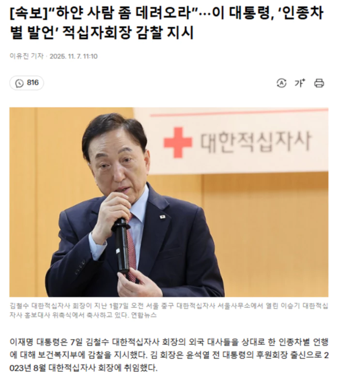 김남준 대통령실 대변인은 이날 언론 알림을 통해 “적십자 회장이 앙골라, 인도, 체코, 스리랑카 등 외국 대사를 대상으로 인종차별 언행을 했다는 언론 보도와 관련해 이재명 대통령은 해당 행위를 엄중히 질책하고 복지부에 감찰을 지시했다”고 밝혔다. 이 대통령은 “인종, 민족, 국가, 지역 등 모든 차별과 혐오는 국가공동체를 위해 하는 심각한 반사회적 행위”라며 “확실한 근절대책을 수립하라고 각 부처에 지시했다”고 김 대변인은 전했다. 전날 한 매체가 보도한 녹취록에 따르면 김 회장은 2023년 11월 대한적십자사 갈라쇼를 개최한 뒤 직원들에게 “갈라에서 내가 뭘 느낀 줄 아느냐. 외국 대사들 별 볼 일 없는 사람들이 다 모이더라”라며 “얼굴 새까만 사람만 모으지 말고 하얀 사람 좀 데려오라”고 지시했다. 김 회장은 “변두리 국가에서 와서 전혀 도움이 안 되는 사람만 오더라. 소위 ‘빅5’에서 한두 명은 꼭 오게끔 만들라”고 말했다. 이 같은 지시에 대한적십자사는 이듬해 미국·영국·독일 등 23개국만 골라 초청장을 보낸 것으로 전해졌다. .. 후략 ..