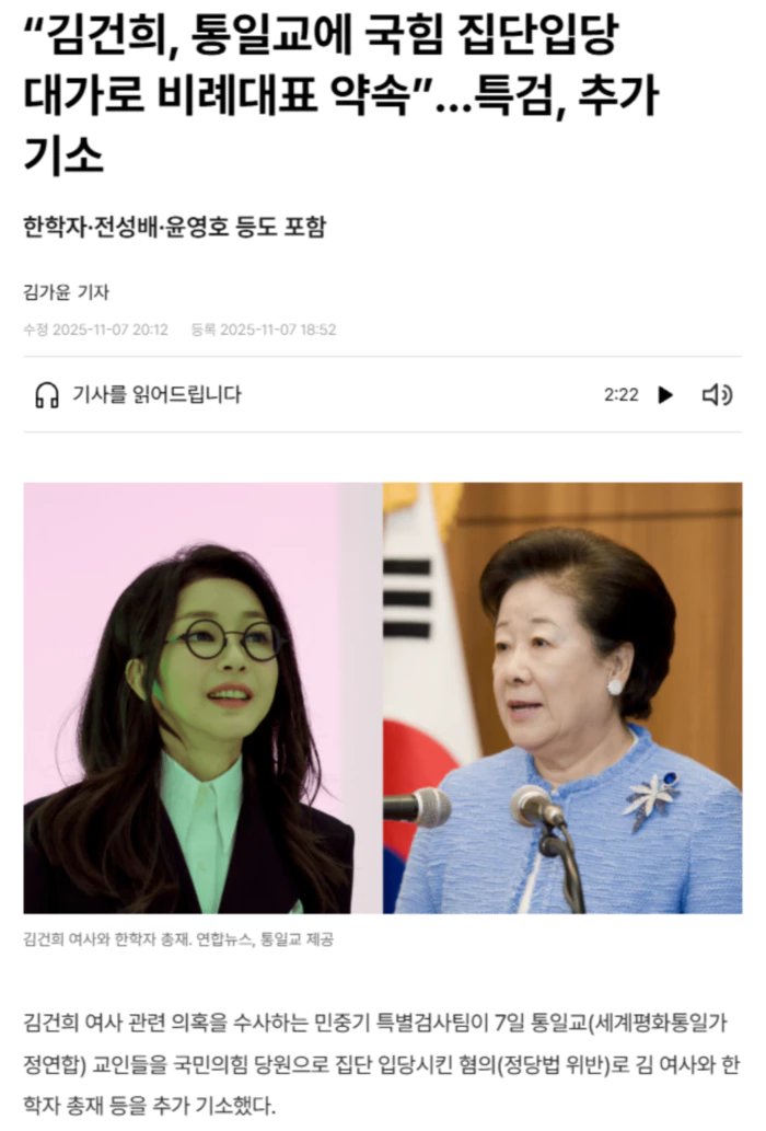 특검팀은 이날 김 여사와 한 총재, ‘건진법사’ 전성배씨, 정원주 전 총재 비서실장, 윤영호 전 세계본부장을 정당법 위반 혐의로 추가 기소했다고 밝혔다. 김 여사는 2023년 3월8일 국민의힘 전당대회에서 윤석열 전 대통령과 자신이 지지하는 후보를 당대표로 선출하려고, 전씨와 공모해 통일교 쪽에 도움을 요청한 혐의를 받는다. 특검팀은 앞서 김 여사 공소장에서, 2022년 11월 초순께 김 여사가 전씨를 통해 윤 전 본부장에게 교인의 집단 가입을 요청했다고 적었다. 당시 윤 전 본부장은 전씨에게 “윤심은 정확히 무엇입니까” “전당대회에 (동원해야 할 당원 등이) 어느 정도 규모로 필요한가요”라는 문자메시지를 보냈고, 이에 전씨는 “윤심은 변함없이 권(성동)”이라고 답한 사실이 드러났다. 하지만 권성동 의원이 2023년 1월 당대표 경선 불출마를 선언하자 통일교는 이른바 ‘윤핵관’(윤석열 전 대통령 측근들) 세력의 대타인 김기현 의원 지지에 힘을 보탠 것으로 전해졌다. 김 여사는 통일교의 집단 입당 대가로 통일교 정책 지원 등 재산상 이익과 통일교 몫의 국회의원 비례대표 제공을 약속한 것으로도 조사됐다. 특검팀은 전씨와 김 여사가 이를 통일교 쪽에 제안했고 한 총재와 정 전 실장, 윤 전 본부장이 이를 승낙해 집단 입당이 실현됐다며 이들을 모두 정당법 위반 혐의로 추가 기소했다. 정당법 42조에서는 자유의사에 반하는 정당 가입을 금지하고 있다. .. 후략 ..