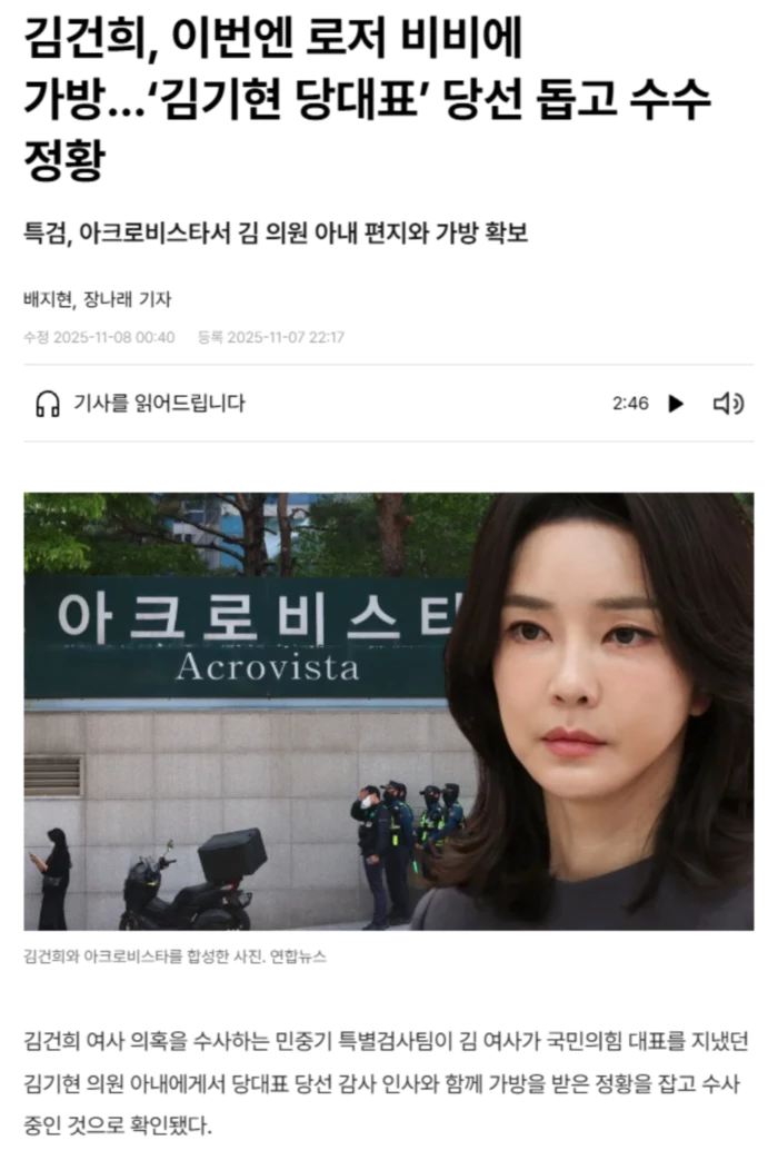 7일 한겨레 취재 결과 특검팀은 전날 김 여사의 주거지인 서울 서초구 아크로비스타를 압수수색하면서 로저 비비에 가방과 함께 김 의원의 아내 이름이 적힌 메모지와 편지 등을 확인했다. 특검팀은 이후 법원에서 압수수색 영장을 새로 발부받아 가방 등을 압수했다. 전날 특검팀은 인테리어 업체인 21그램 대표 아내 조아무개씨가 김 여사에게 크리스티앙 디오르(크리스챤 디올) 제품을 전달하고 관저 공사를 수주했다고 보고 아크로비스타에 대한 압수수색에 나선 바 있다. 이 과정에서 로저 비비에 가방도 확보한 것이다. 특검팀은 해당 제품의 가격을 100만원 초반으로 확인했다. 공직자의 배우자에게 직무와 관련해 100만원 이상의 금품을 전달한 사람은 청탁금지법의 처벌 대상이 된다. 특검팀은 김 의원의 아내와 김 여사를 모두 피의자로 특정하고 청탁금지법 위반 혐의를 적용해 압수수색 영장을 발부받은 것으로 알려졌다. 로저 비비에 가방과 함께 발견된 김 의원 아내의 편지에는 “당대표 당선을 도와줘서 감사하다”라는 내용과 함께 편지를 작성한 날짜가 적혀 있었다. 편지에 기재된 날짜는 2023년 3월17일로 김 전 의원이 전당대회에서 당대표로 당선된 9일 뒤였다. 특검팀은 이날 2023년 3월 전당대회를 앞두고 통일교(세계평화통일가정연합) 교인들을 국민의힘 당원으로 집단 입당시킨 혐의(정당법 위반)로 김 여사와 한학자 총재 등을 추가 기소했는데, 이런 방식으로 김 의원이 당대표 당선에 도움을 받았다고 보고 있다. .. 후략 ..