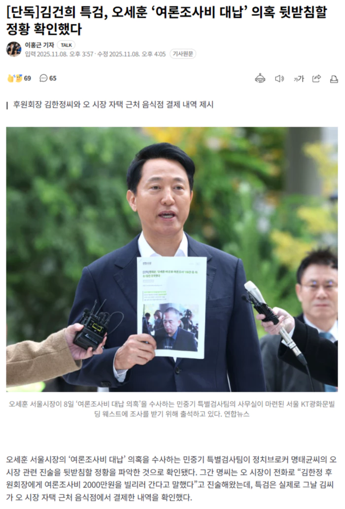 8일 경향신문 취재를 종합하면 특검은 이날 오전 오 시장과 명씨를 대질신문하며 2020년 1월22일 전화 통화에 대해 캐물었다고 한다. 명씨는 지난 4월29일 검찰 조사에서 오 시장이 당일 4차례 전화를 걸어 여론조사를 부탁했다고 주장했다. 명씨는 “오 시장으로부터 2021년 재보궐선거 당시 전화가 와 ‘선거법 때문에 여론조사 비용을 직접 못 줘 김씨에게 2000만원을 빌리러 가고 있다’고 말했다”는 취지로 진술했다. 오 시장이 김씨에게 돈을 빌리는 형식으로 여론조사 비용을 대납케 했다는 것이다. 오 시장은 특검에서 당일 김씨를 만나지 않았다는 취지로 진술한 것으로 전해졌다. 이날이 오 시장 아내의 생일이라 가족과 함께 있었다는 것이다. 그러자 특검은 김씨가 오 시장 자택 근처 음식점에서 결제한 내역을 제시하며 “김씨를 만난 것 아니냐”고 물었다고 한다. 특검은 또 오 시장의 측근인 강철원 전 정무부시장이 카드가 결제된 직후 명씨에게 정기 여론조사 결과와 함께 “여론조사 관련해 필요하신 게 있으면 저한테 말씀하시면 된다”고 전한 카톡 메시지도 오 시장에게 제시한 것으로 전해졌다. 앞서 명씨는 같은 날 오 시장이 전화를 걸어 “서울시장 자체조사 뿐만 아니라 공표 조사까지 철원이하고 의논해서 여론조사를 알아서 진행해주시고, 그 비용은 김한정 회장이 계속 지원하도록 말하겠습니다”라고 했다고 검찰에 진술했다. 오 시장은 2021년 서울시장 보궐선거 당시 명씨가 운영한 것으로 알려진 여론조사업체 미래한국연구소로부터 13차례 비공표 여론조사 결과를 받고, 비용 3300만원을 후원자 김한정씨가 대납하도록 했다는 의혹을 받는다. 오 시장 측은 김씨의 비용 지급과 무관하다고 주장해왔다. . 후략 ..
