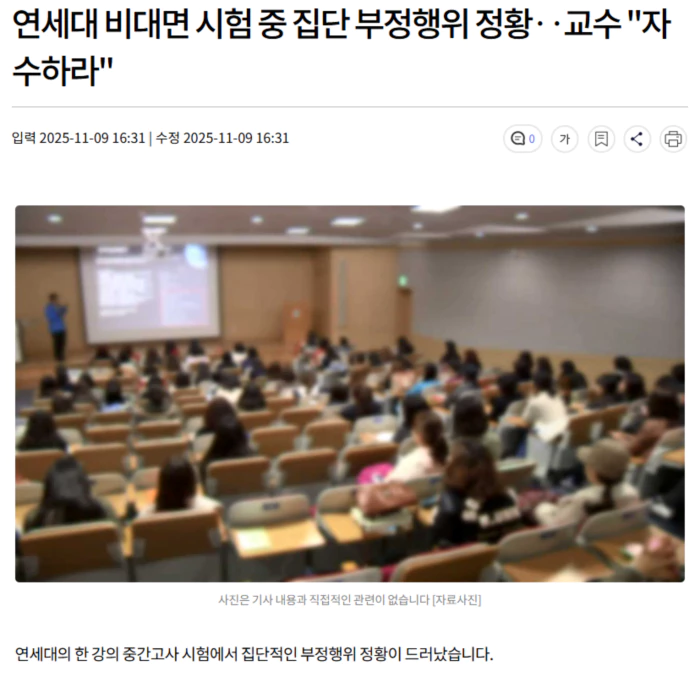 해당 교수는 "자수하는 경우 중간고사 성적만 0점 처리할 방침"이라며 자수를 권유한 상태입니다.